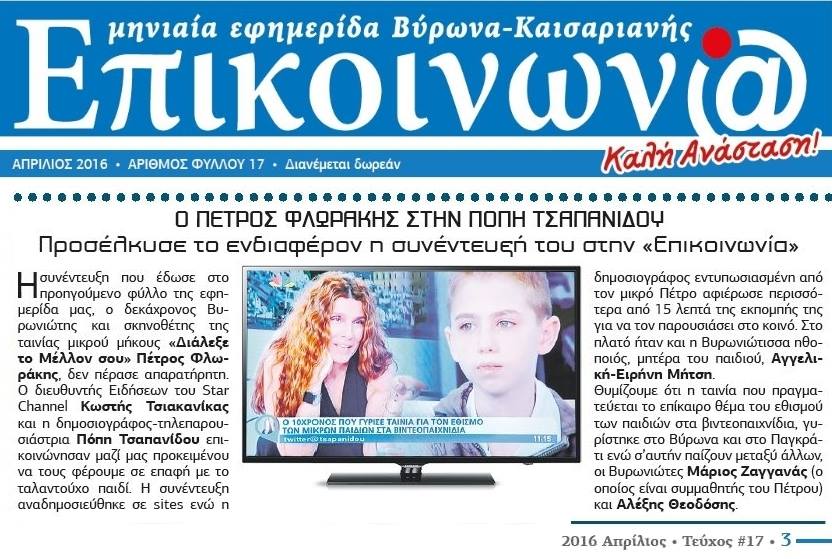 Με αφορμή την ταινία του «Choose Your Future» του δεκάχρονου Πέτρου Φλωράκη, συνέντευξή του στην μηνιαία εφημερίδα Βύρωνα Καισαριανής ΕΠΙΚΟΙΝΩΝΙΑ και τον δημοσιογράφο Florent Celhay
